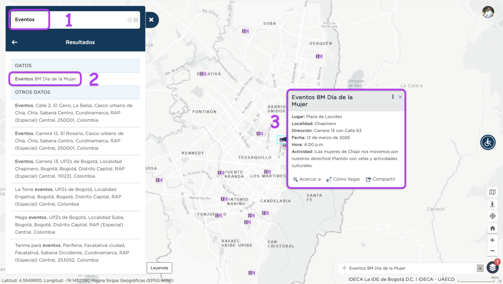 Paso 1: Ingresa a mapas.bogota.gov.co, en el buscador escribe la palabra “Eventos”.